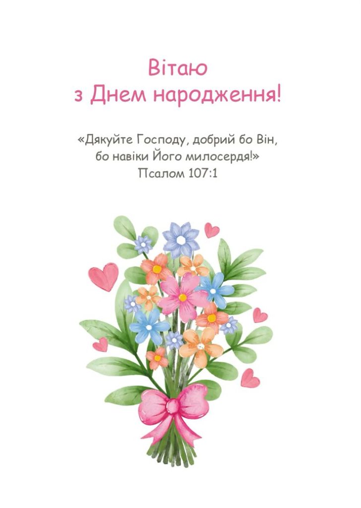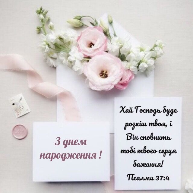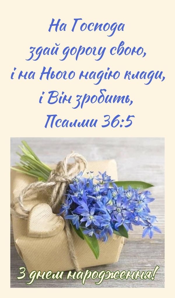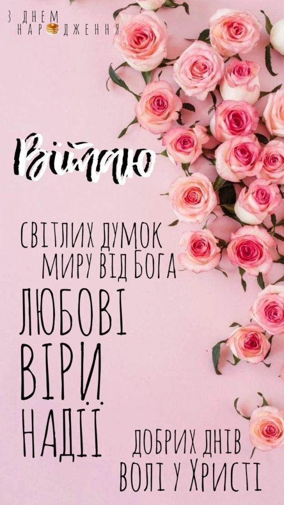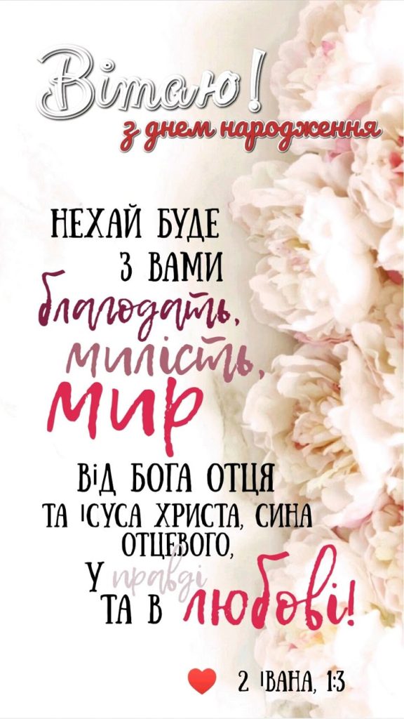 З днем народження! Бажаю тобі завжди мати у серці плоди Духа Святого: любов, радість, мир, довготерпіння. Нехай милосердя буде твоїм одягом, а віра — твоїм щитом. Бажаю, щоб Слово Боже було світильником для твоїх ніг і світлом для твоєї стежки.